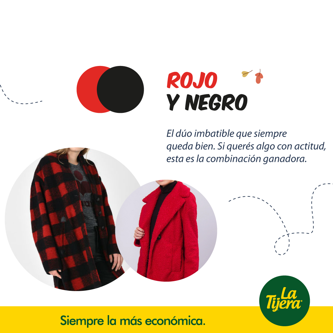 - Negro y rojo: la combinación infalible que nunca pasa de moda. Perfecta para looks con contraste y personalidad