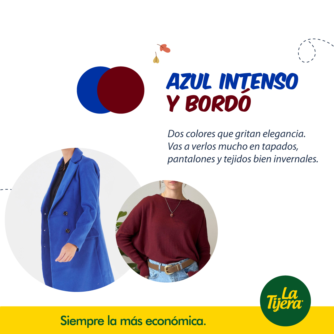 - Azul intenso y bordó: dos colores que transmiten profundidad y sofisticación, perfectos para prendas de abrigo y accesorios